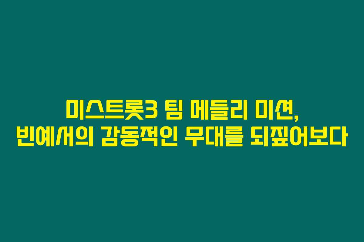 미스트롯3의 팀 메들리 미션은 빈예서와 복드림걸즈가 보여준 강력한 팀워크와 무대 완성도의 중요성을 일깨워주는 무대였어요. 빈예서의 실수조차 멋진 경험으로 바뀌었고 앞으로의 성장도 기대됩니다. 더 많은 미스트롯3 관련 소식은 계속해서 지켜봐 주세요!