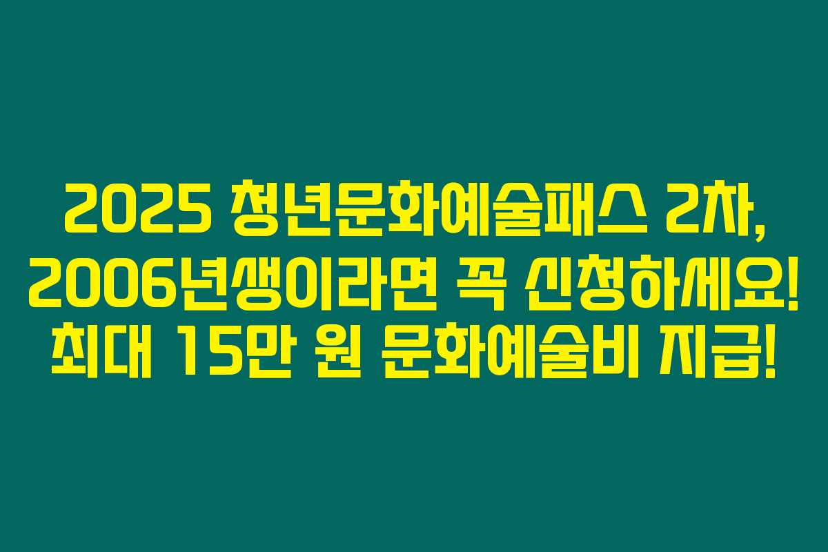 이번 2025 청년문화예술패스 2차 신청 기회를 통해, 2006년생 청년들은 최대 15만 원의 지원금을 통해 멋진 문화생활을 누릴 수 있을 거예요. 충분한 정보와 다양한 혜택을 놓치지 마세요!