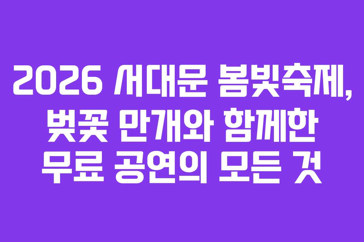 2026 서대문 봄빛축제는 벚꽃과 함께하는 무료 공연들로 가득 찬 특별한 행사이다. 사전예약을 통해 다양한 프로그램을 즐길 수 있으며, 현장 참여도 가능하다. 벚꽃 만개 시기를 맞춰 가족과 친구들과 함께 방문하여 아름다운 봄의 정취를 만끽할 수 있는 기회를 놓치지 말도록 하자.